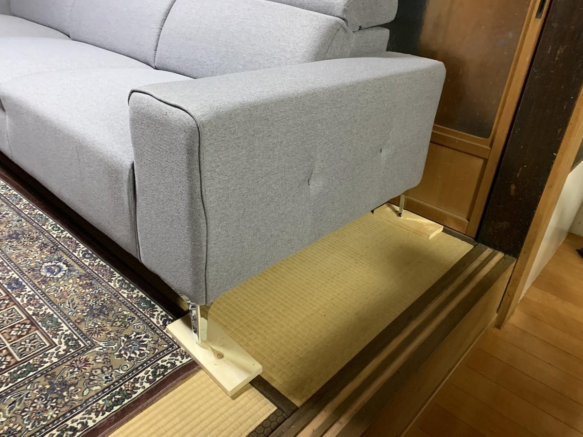 ソファの脚は畳に食い込んで畳を傷めてしまうので、板材をカットして保護しました。